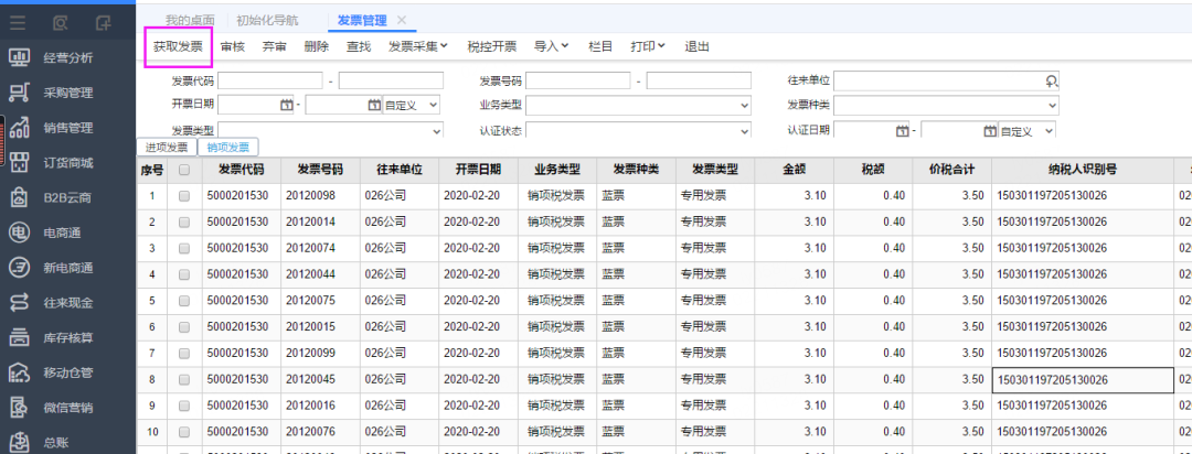 企业财务人员根据核算要求,在T+发票管理中,可以根据查询条件将扫码开票的结果批量采集到系统中,完成后续的智能财务核算工作,轻松实现业票财税一体化。