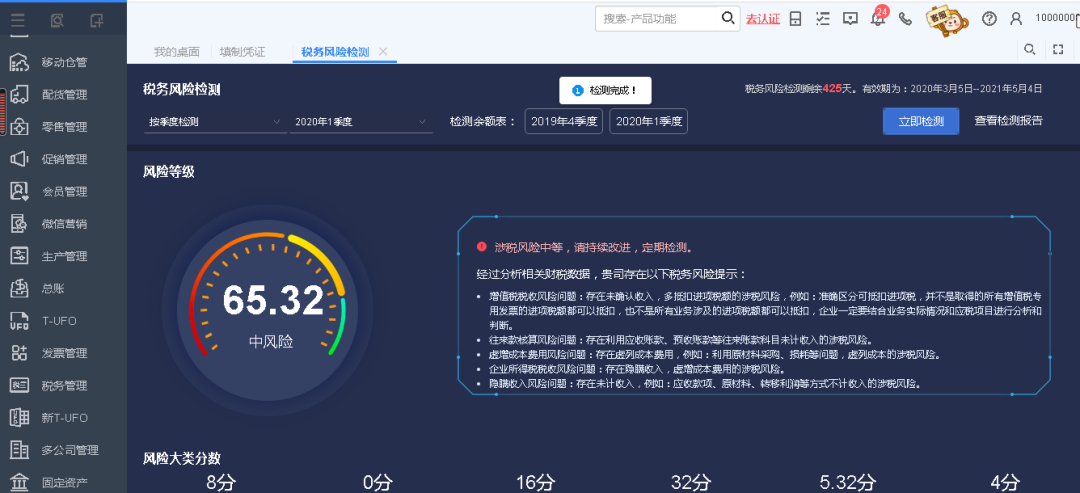 2>支持保存上一次检测结果,实现检测历史数据自动存档备查。不管是按年、按季、还是按月检测,检测结果系统自动记录,记录企业的税收风控足迹,为税务风控提供追溯依据。