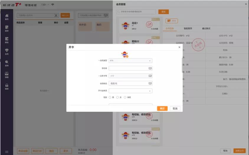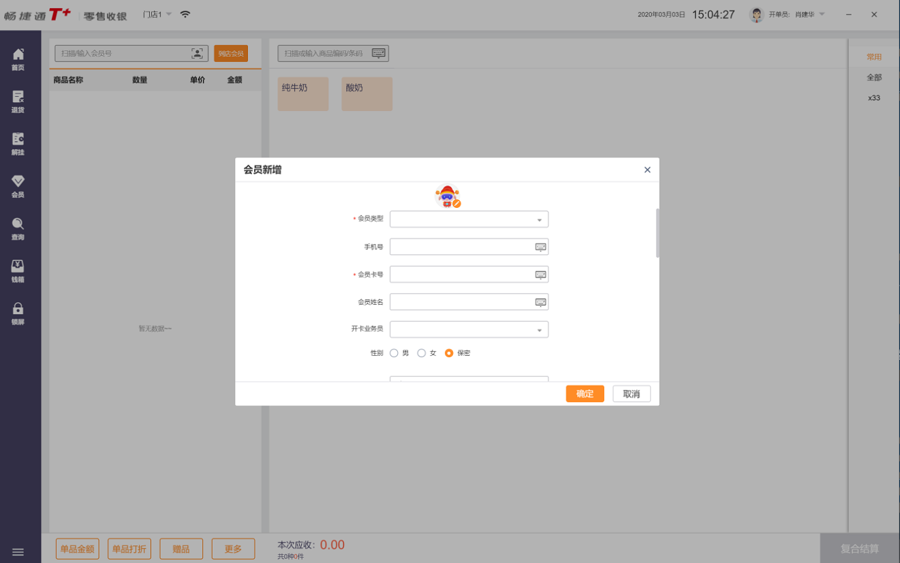 在零售收银界面,点“会员新增”后,在会员新增界面,指定会员类型,记录会员名称、手机号等信息。