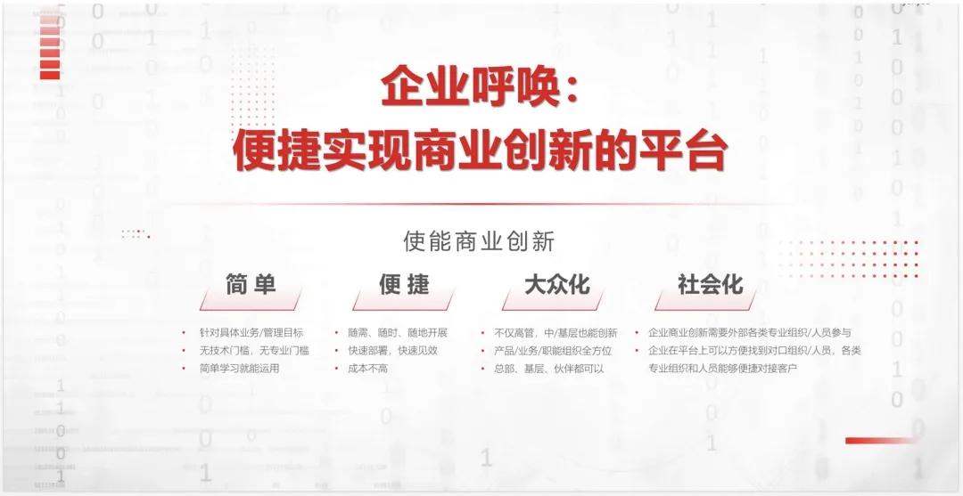 企业推进基于数智化的商业创新,需要移除技术、商业和成本“三座大山”,呼唤能够便捷实现商业创新的平台,使能商业创新简单、便捷、大众化、社会化。