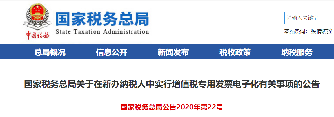 国家税务总局关于在新办纳税人中实行增值税专用发票电子化有关事项的公告国家税务总局公告2020年第22号