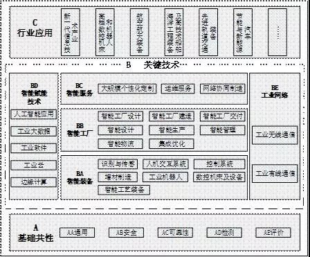 《国家智能制造标准体系建设指南(2018年版)》同时提出了智能制造标准体系结构,他包括了A基础共性,B关键技术,C行业应用,从下往上,主要反映标准体系各部分的组成关系,与智能制造系统架构具有映射关系。