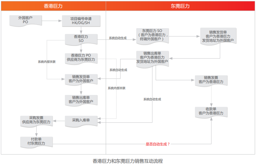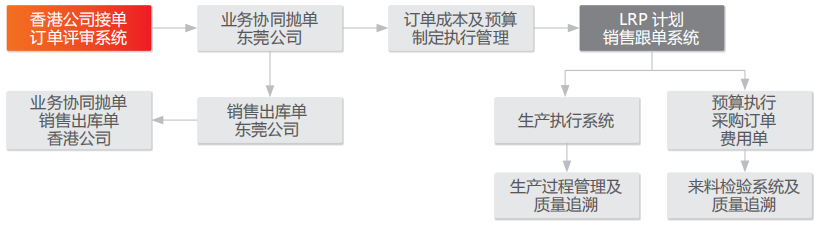 • 通过多组织业务协同平台,实现香港公司与东莞制造基地之间内部销售与采购、内外销售发货等协同管理。
