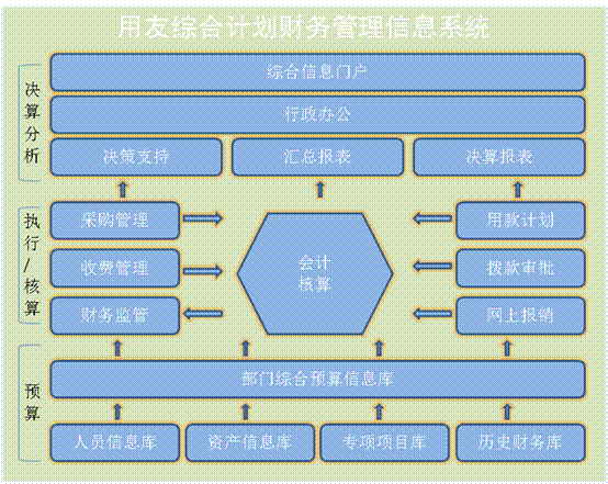 用友综合计划财务解决方案就是为了解决部门预算财务管理中存在的以上问题,通过现代信息网络技术,构建以主管部门财务资源全面管理为目标,以部门基础信息库为基础,以计划预算管理为核心,以项目管理为重点、以预算决策、预算执行、财务核算、部门决算等全过程管理为主线,以预算过程控制为手段,全面反映部门资金、资产、人员等政府财务资源信息的动态管理信息系统。