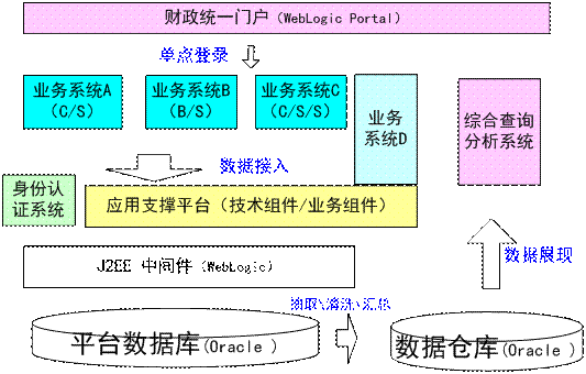 系统实现整合了CA,通过财政管理门户支持单点登录,可以导航到不同构架业务系统(C/S、B/S、C/S/S);对账务系统进行配置,各业务系统通过平台将数据写入平台数据库;所有业务数据经过抽取、清洗和汇总后进入数据仓库,作为综合查询分析系统的数据源。通过平台,实现系统数据规范化与互联互通,不断提高财政系统数据共享、查询、分析与利用效率,完善预算编制与预算执行分析等。通过基于金财工程应用支撑平台一体化建设,打造科学、安全、精细、高效的财政管理应用系统,实现“业务流程一体化、规范化、业务运作信息化、电子支付;系统操作简易化、便捷化;财政管理的科学化、精细化;领导决策的科学化、高效化;财政监督工作的全程化”的目标。